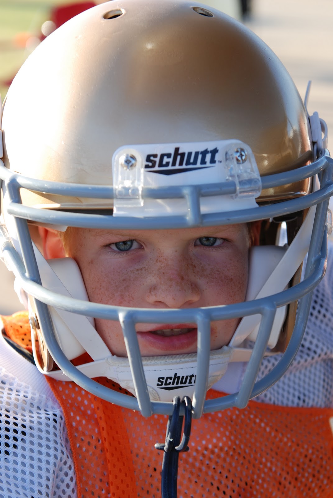 Gavin is playing tackle football this year. Once he found out that there were positions that didn't touch the ball or run, he was pretty excited. He is loving tackling other kids. These photos are from the scrimmage. Poor Carter was standing too close to the field and when the play went out of bounds he was tackled too. Another parent caught Carter's reaction.